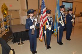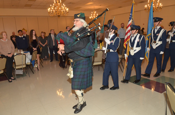 Master of Ceremonies' Molly Chorman officiated the ceremony by calling on the bagpiper to lead the procession of inductees and their wingmen into the hall. The Delaware Air National Guard Cadet Squadron Color Guard opened the ceremony with the posting of the colors, followed by the singing of the "Star Spangled Banner".